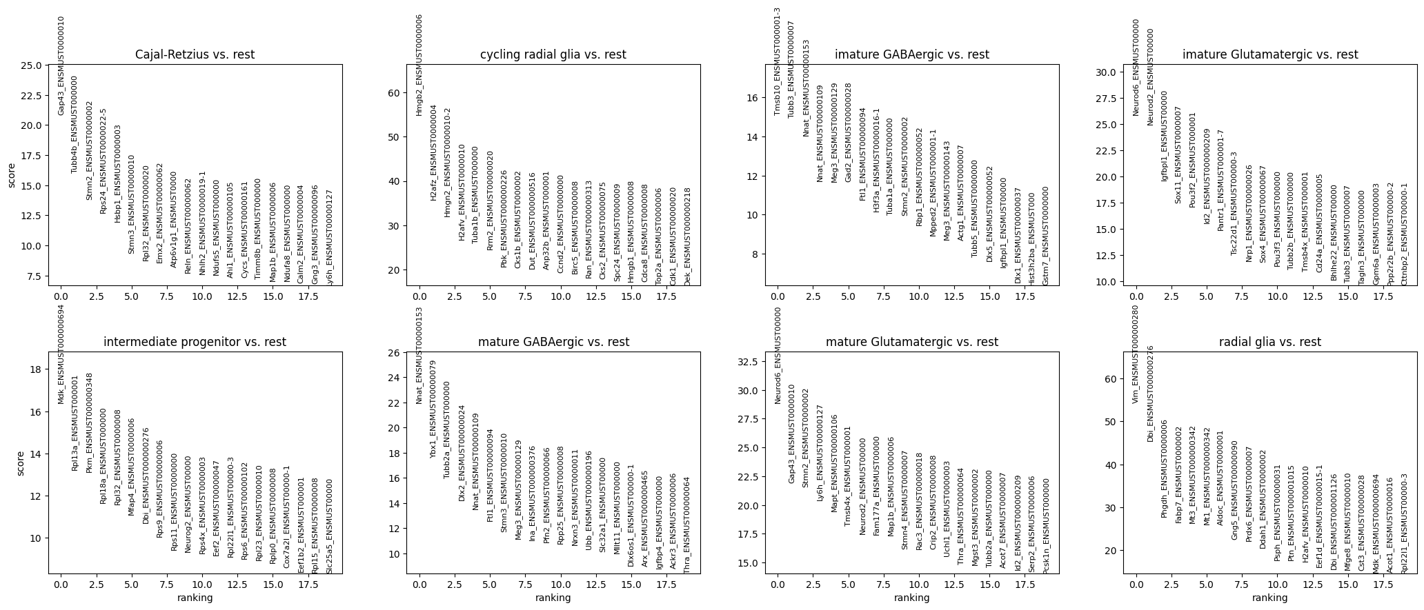 # Concatenate the gene name before the transcript ID in the transcript matrixtranscript_matrix = sicelore_mouse_data.copy()# Convert 'geneId' to string to avoid TypeError when concatenating with indextranscript_matrix.var['geneId'] = transcript_matrix.var['geneId'].astype(str)# Assuming 'gene_name' and 'transcript_id' are columns in the var DataFrame of the AnnData objecttranscript_matrix.var['gene_transcript_id'] = transcript_matrix.var['geneId'] +'_'+ transcript_matrix.var.index.astype(str)# Truncate the gene_transcript_id to fit better in plotstranscript_matrix.var['gene_transcript_id'] = transcript_matrix.var['gene_transcript_id'].str.slice(0, 20)# Update the var index to use the new truncated gene_transcript_idtranscript_matrix.var.index = transcript_matrix.var['gene_transcript_id']transcript_matrix.var_names_make_unique()# Log transform and CPM normalize the transcript matrixsc.pp.normalize_total(transcript_matrix, target_sum=1e6)sc.pp.log1p(transcript_matrix)# Perform differential expression analysis to rank genes on the transcript matrixsc.tl.rank_genes_groups(transcript_matrix, 'cell_type', method='t-test')# Plot the ranked gene groups with adjusted figure sizesc.pl.rank_genes_groups(transcript_matrix, n_genes=20, sharey=False, figsize=(12, 10))sc.pl.rank_genes_groups_heatmap(transcript_matrix, show_gene_labels=True)
