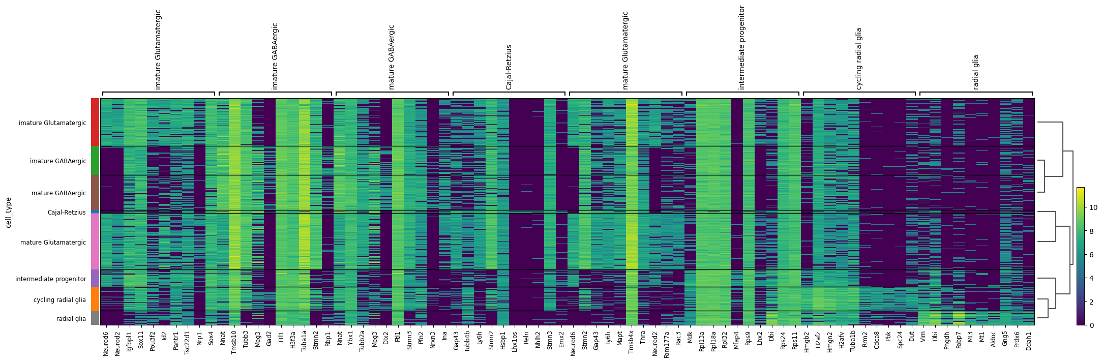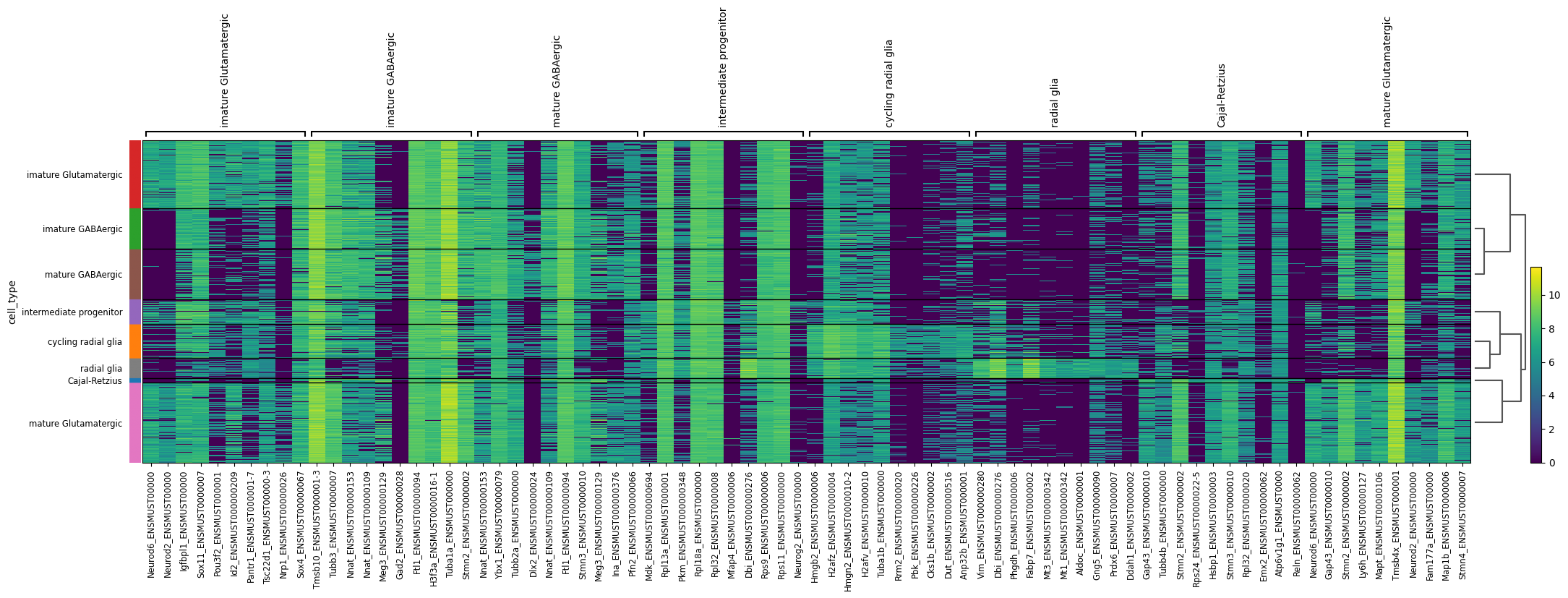 WARNING: dendrogram data not found (using key=dendrogram_cell_type). Running `sc.tl.dendrogram` with default parameters. For fine tuning it is recommended to run `sc.tl.dendrogram` independently.