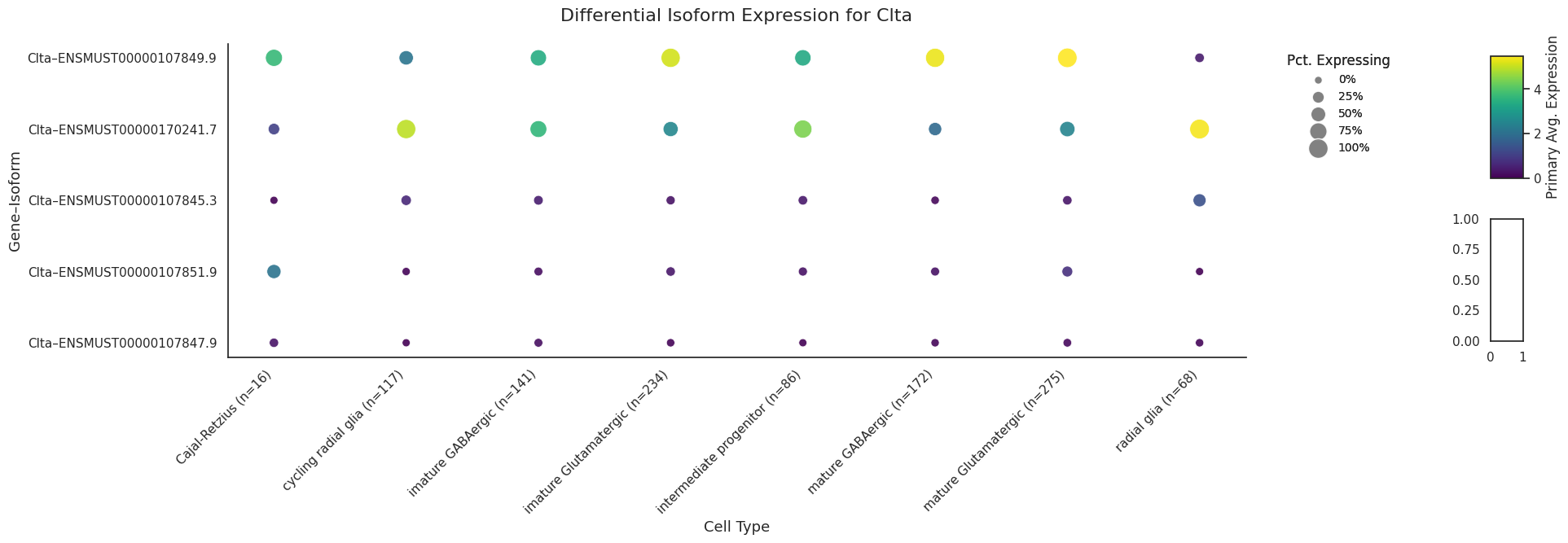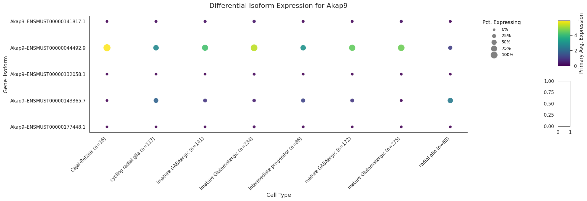 To gain a deeper understanding of how isoforms structurally differ across various cell types, we can analyze the inclusion of different exons in the final transcript structure. A useful metric for this analysis is the Percent Spliced In (PSI) value, which quantifies the proportion of transcripts that include a particular exon. By calculating the PSI for each exon, we can identify and compare the structural variations of isoforms between cell types, providing insights into their functional implications and regulatory mechanisms. This approach allows us to pinpoint specific exons that contribute to the diversity of isoform expression and understand their role in cellular differentiation and function.