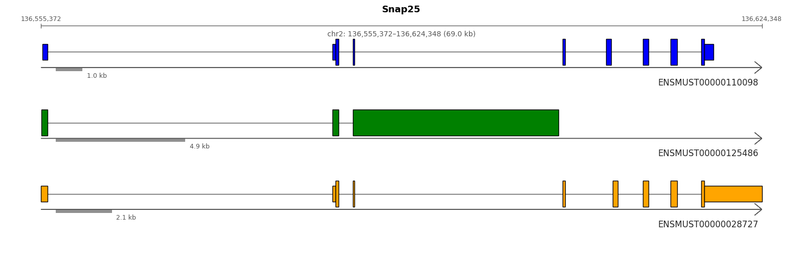 from allos.switch_search import get_top_n_isoformstop_n = get_top_n_isoforms(sicelore_mouse_data_copy, gene_id='Snap25', strip=True)tp.draw_transcripts_list(top_n, draw_cds=True, show_ticks=True)