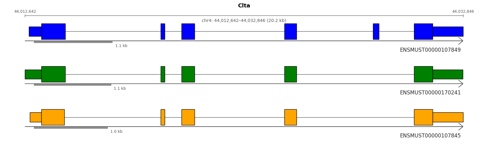 Lets take a quick look at an individual gene CLTA and examine some of its transcripts.
