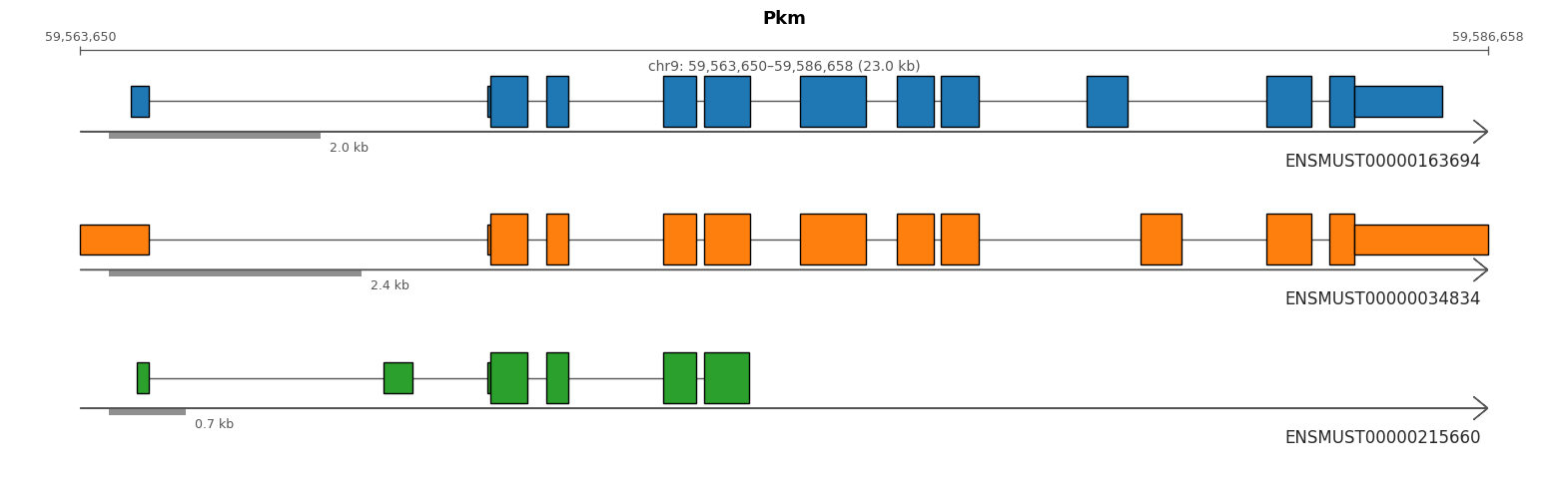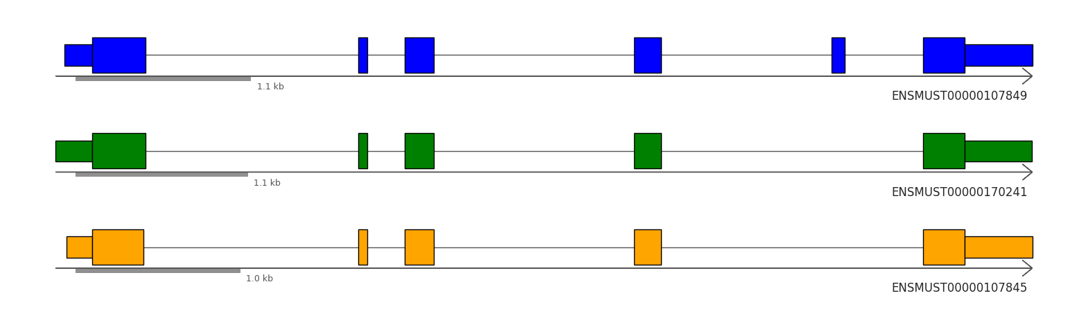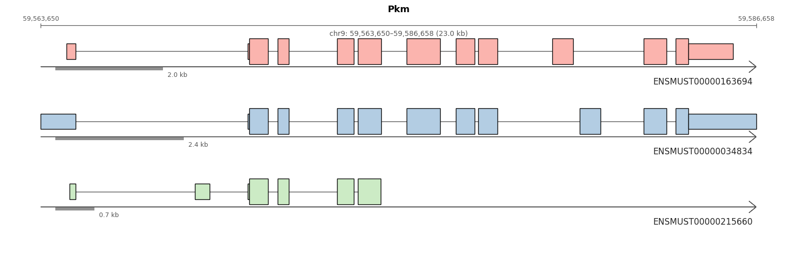 import allos.visuals as vsvs.plot_transcripts(sicelore_mouse_data_copy, gene_id='Pkm')