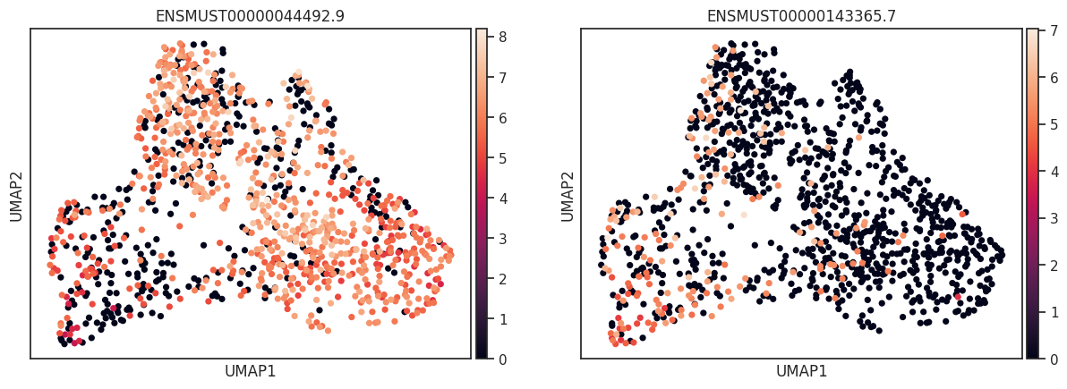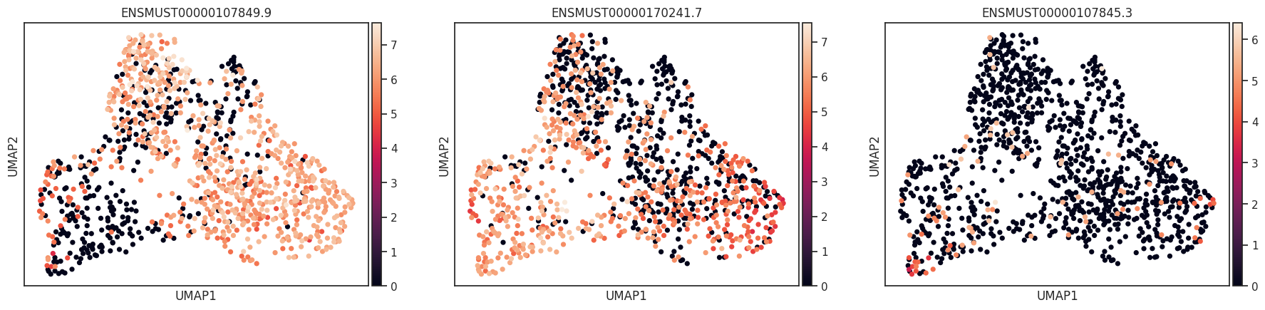 # Perform the operations on a copy of the sicelore_mouse_datasicelore_mouse_data_copy = sicelore_mouse_data.copy()sc.pp.normalize_total(sicelore_mouse_data_copy, target_sum=1e6)sc.pp.log1p(sicelore_mouse_data_copy)sc.pp.neighbors(sicelore_mouse_data_copy)sc.tl.umap(sicelore_mouse_data_copy)