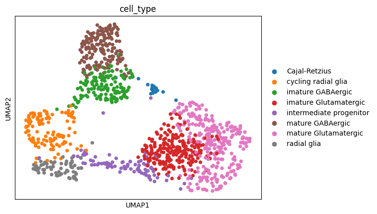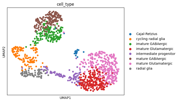 import scanpy as sc# Make a copy of the original data to preserve itoriginal_sicelore_mouse_data = sicelore_mouse_data.copy()# Perform the operationssc.pp.normalize_total(sicelore_mouse_data, target_sum=1e6)sc.pp.log1p(sicelore_mouse_data)# Select the top 5000 highly variable genessc.pp.highly_variable_genes(sicelore_mouse_data, n_top_genes=5000)sicelore_mouse_data = sicelore_mouse_data[:, sicelore_mouse_data.var.highly_variable]sc.pp.neighbors(sicelore_mouse_data)sc.tl.umap(sicelore_mouse_data)sc.pl.umap(sicelore_mouse_data, color='cell_type')# Restore the original datasicelore_mouse_data = original_sicelore_mouse_data
