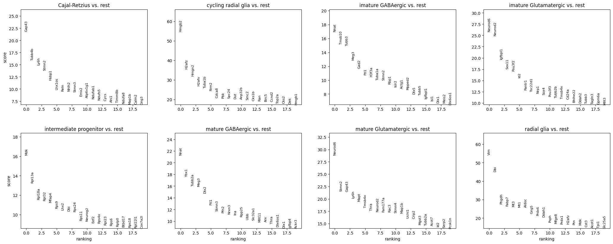 sc.pp.normalize_total(gene_anndata, target_sum=1e6)sc.pp.log1p(gene_anndata)# Perform differential expression analysis to rank genes on the gene matrixsc.tl.rank_genes_groups(gene_anndata, 'cell_type', method='t-test')# Plot the ranked gene groups with adjusted figure sizesc.pl.rank_genes_groups(gene_anndata, n_genes=20, sharey=False, figsize=(12, 10))sc.pl.rank_genes_groups_heatmap(gene_anndata, show_gene_labels=True)